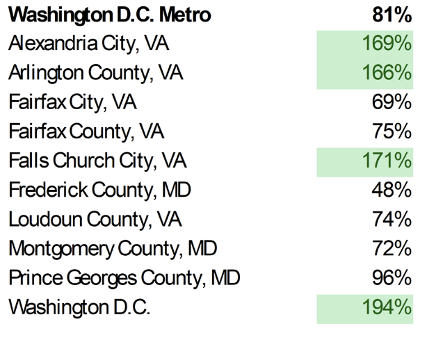 The urban area housing markets tend to have more inventory. In both Philadelphia and Washington, D.C., inventory is above pre-pandemic levels. In the close-in suburbs of Arlington and Alexandria, Virginia, inventory has also surpassed what was available to buyers in 2019.