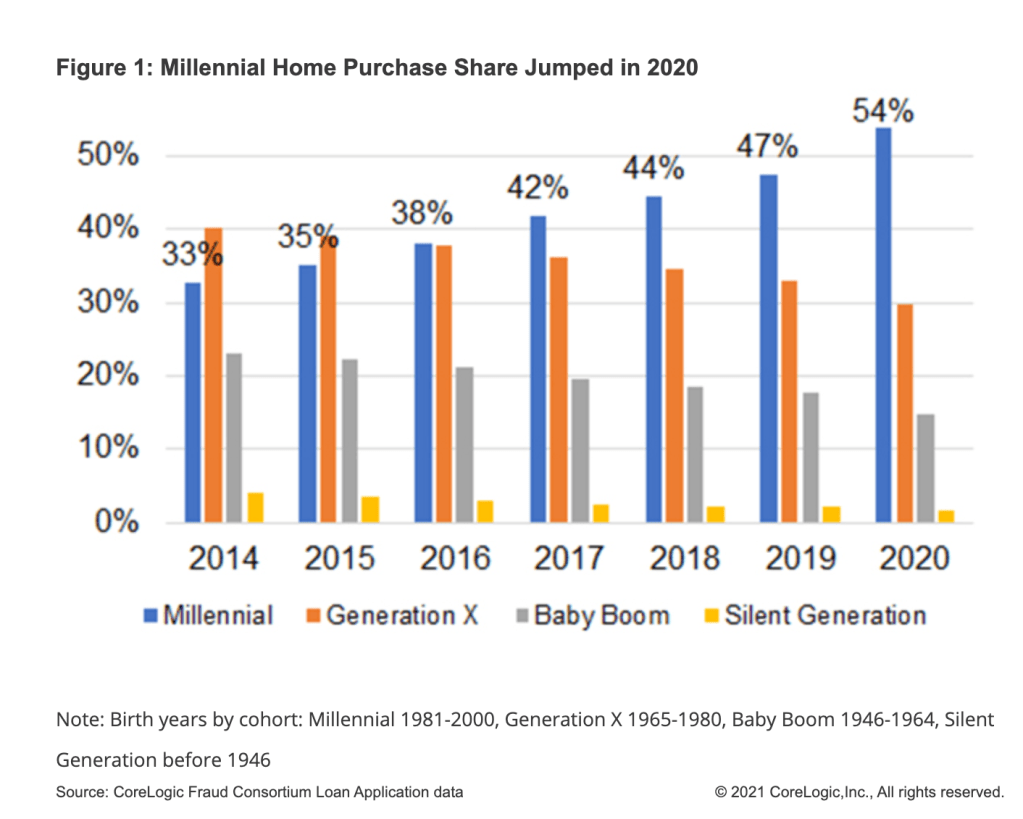 According to the CoreLogic Loan Application Database[1], prior to 2020, while millennial home purchase applications comprised less than half of all purchase applications, their share grew from 33% in 2014 to 47% in 2019, rising about 2 to 4 percentage points per year. This annual increase is consistent with the cohort of millennials reaching 33 years of age, the peak homebuying age.