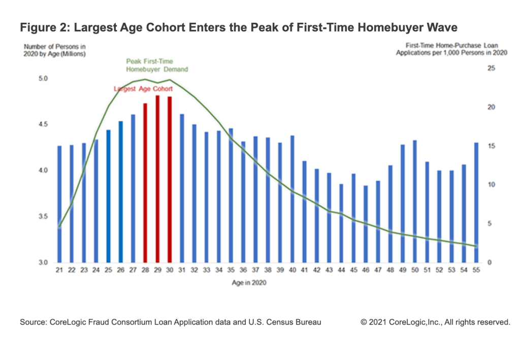 Figure 2 shows U.S. population distribution by age, highlighting the largest demographic cohort reaching the peak age of FTHB on the left axis. The right axis of the chart, displayed by the green line, represents first-time home-purchase loan applications per 1,000 persons in 2020.